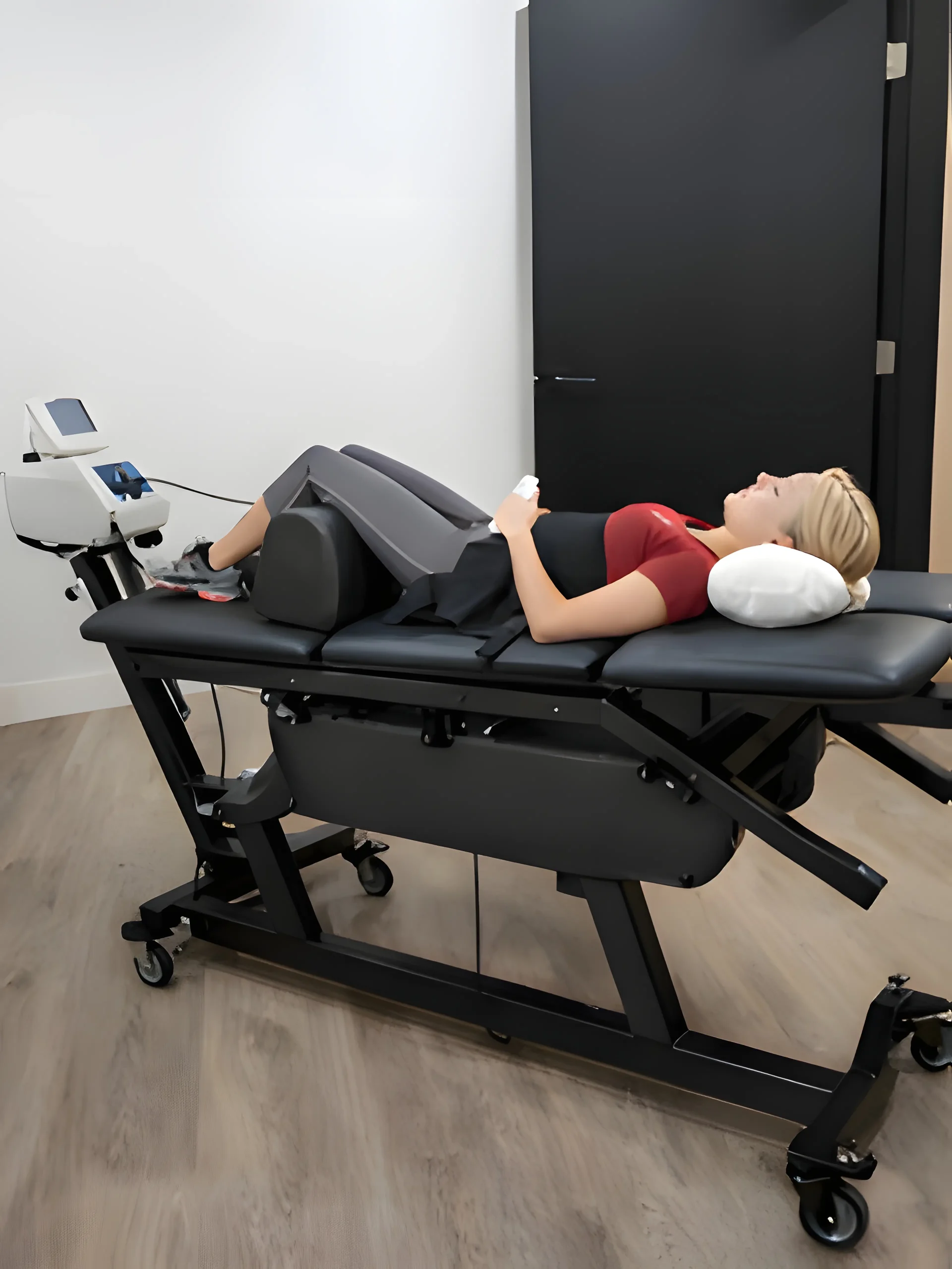 Traction therapy uses a specialised table to apply gentle, controlled stretching to the spine. When clinically appropriate, it may help reduce pressure through the spine to support comfort and mobility as part of a broader treatment plan.